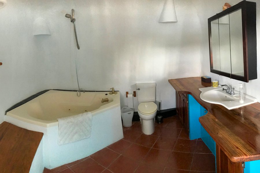 There are three king-size double bedrooms - two on the first floor with doors opening onto the fabulous balcony and one on the ground floor, convenient for outside access (perhaps an early morning dip). On the lower level there is also an open-plan living area with a spiral staircase leading to the upper floor. All 3 bedrooms have their own en-suite bathrooms. A large kitchen / dining area is located on the first floor, which leads through large double doors opening out onto the furnished balcony area, offering al fresco dining and truly stunning waterside views. The property is air-conditioned throughout, although it normally enjoys a cooling tradewind breeze from the east, and there is free WiFi.