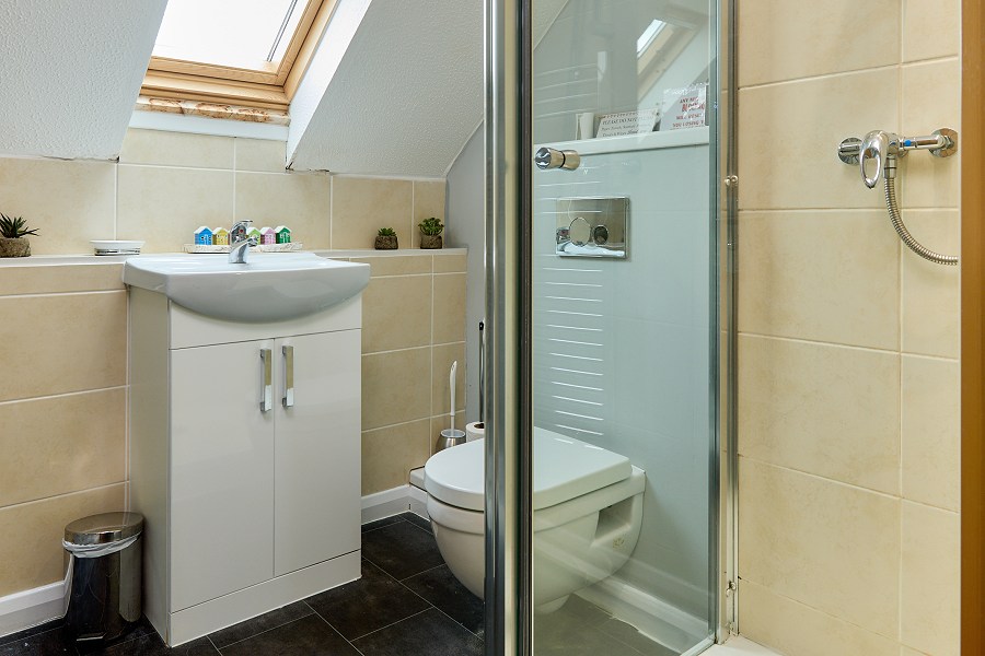 First floor bathroom - bath with shower over, WC, basin & heated towel rail.