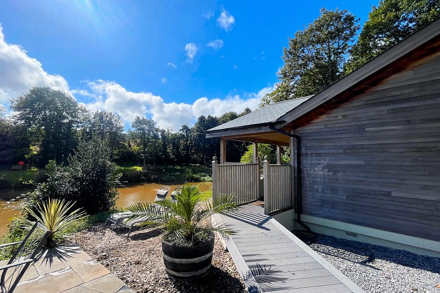 Contemporary 2 bedroom lodge overlooking a stocked fishing lake, situated within 6 acres of a peaceful Devon valley. Fantastic hot tub and wood burning stove.